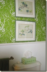 the bathroom is also awesome, with green and white wallpaper, white wainscoting, and clean-as-can-be white porcelain.